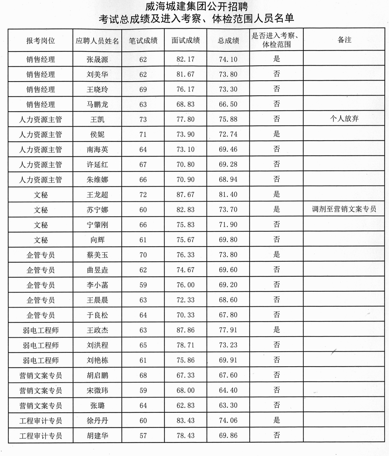 威海城建集團(tuán)公開(kāi)招聘考試總成績(jī)及進(jìn)入考察、體檢范圍人員名單