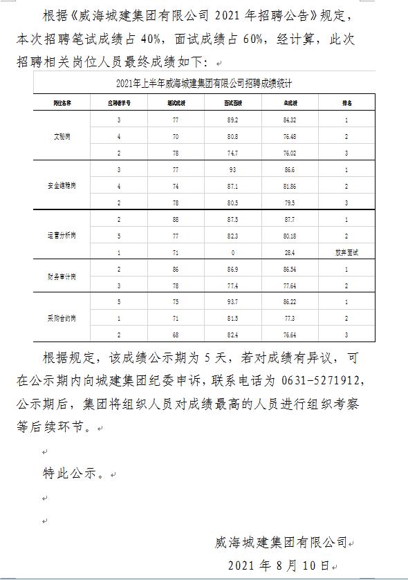 威海城建集團2021年招聘人員面試成績及最終成績的公示發(fā)布時間:2021/8/10 14:09:10  作者:威海城建集團  文章來源:威海城建集團  瀏覽次數(shù):